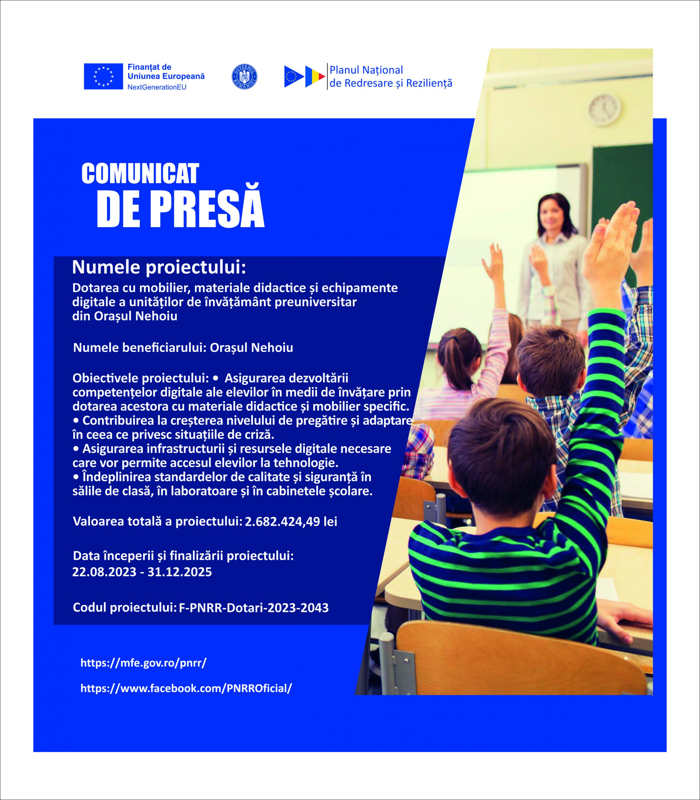 – ANUNȚ – U.A.T. orasul Nehoiu a initiat procedura de consultare publica, in conformitate cu prevederile Legii nr. 52/2003 privind consultarea publica si transparenta decizionala cu privire la aprobarea proiectului de hotarare nr. 1/08.01.2026 privind aprobarea actului aditional nr 1 la Statutul Asociatiei de Dezvoltare Intercomunitara Eco Buzau 2009 si a Statutului actualizat. Etapa consultarii publice are loc in perioada 08.01.2026 – 07.02.2026. Persoanele interesate pot trimite / inregistra sesizarile, observatiile, punctele de vedere la secretariatul Primariei orasului Nehoiu pana in data de 07.02.2026. |